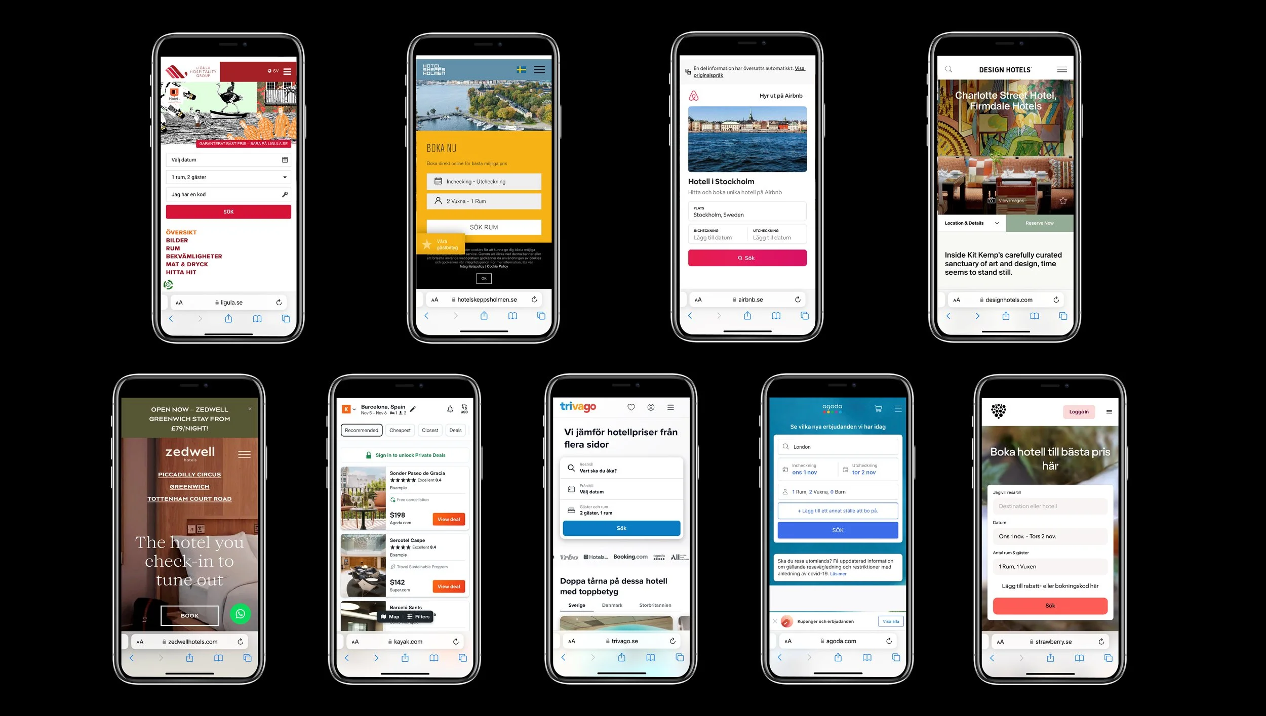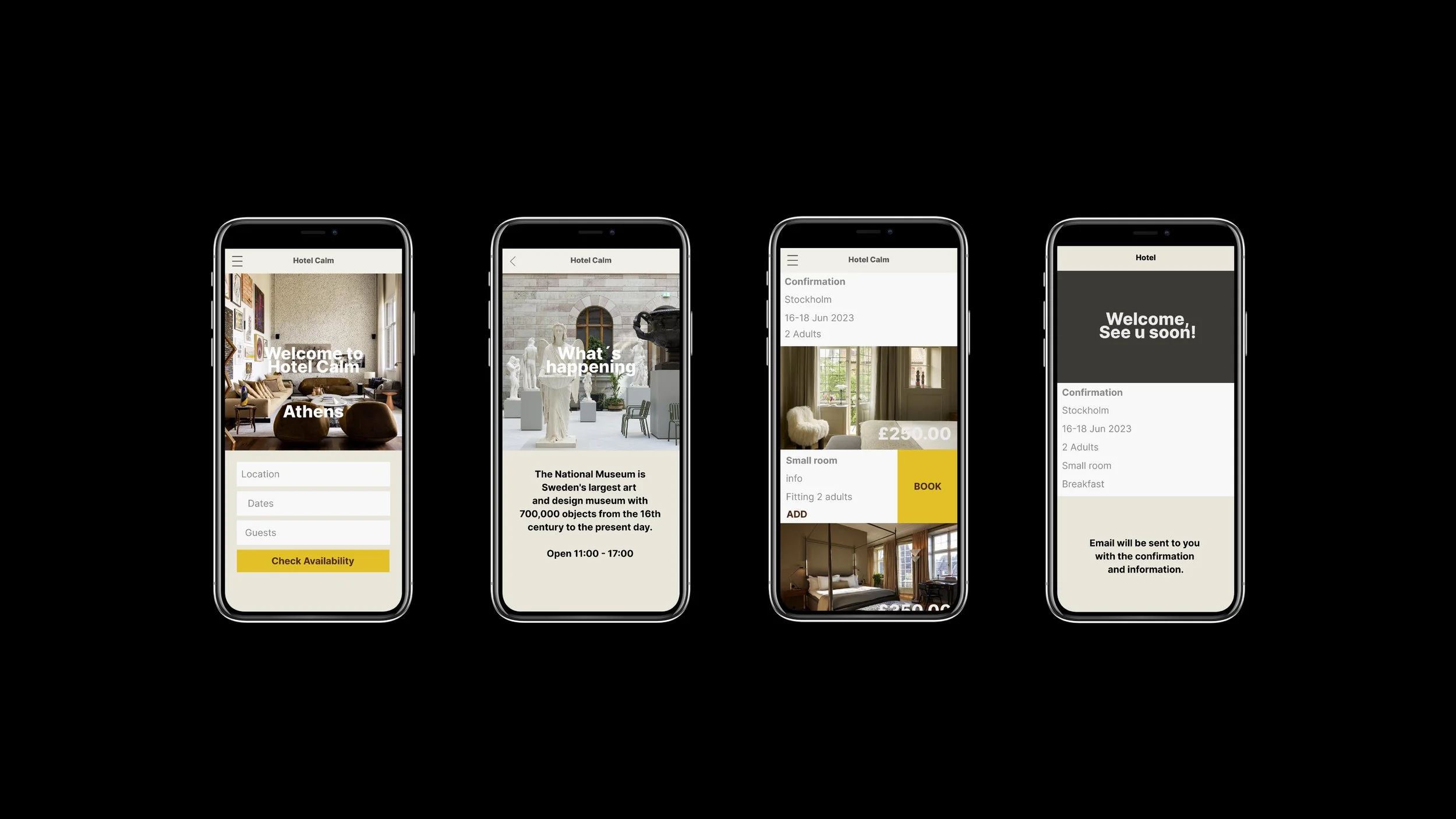 Conducting usability tests and competitor benchmarking shows booking of hotel rooms is often determined by present dates and destination, therefor most booking apps apply a direct approach to check availability, which is good. The calendar function differs from site to site and make a big difference to the felling of ease to use. With a predetermined date and destination, pictures are of course common to set the mood and direction of the app. Most hotel booking apps has a generic expression with a lack of appealing and inviting images that makes the visual presentation, not so interesting. Giving the customer the objective information clearly is important, compared to the competitive apps there is room with simple means to stand out and get the customer more interested and to feel more invited.