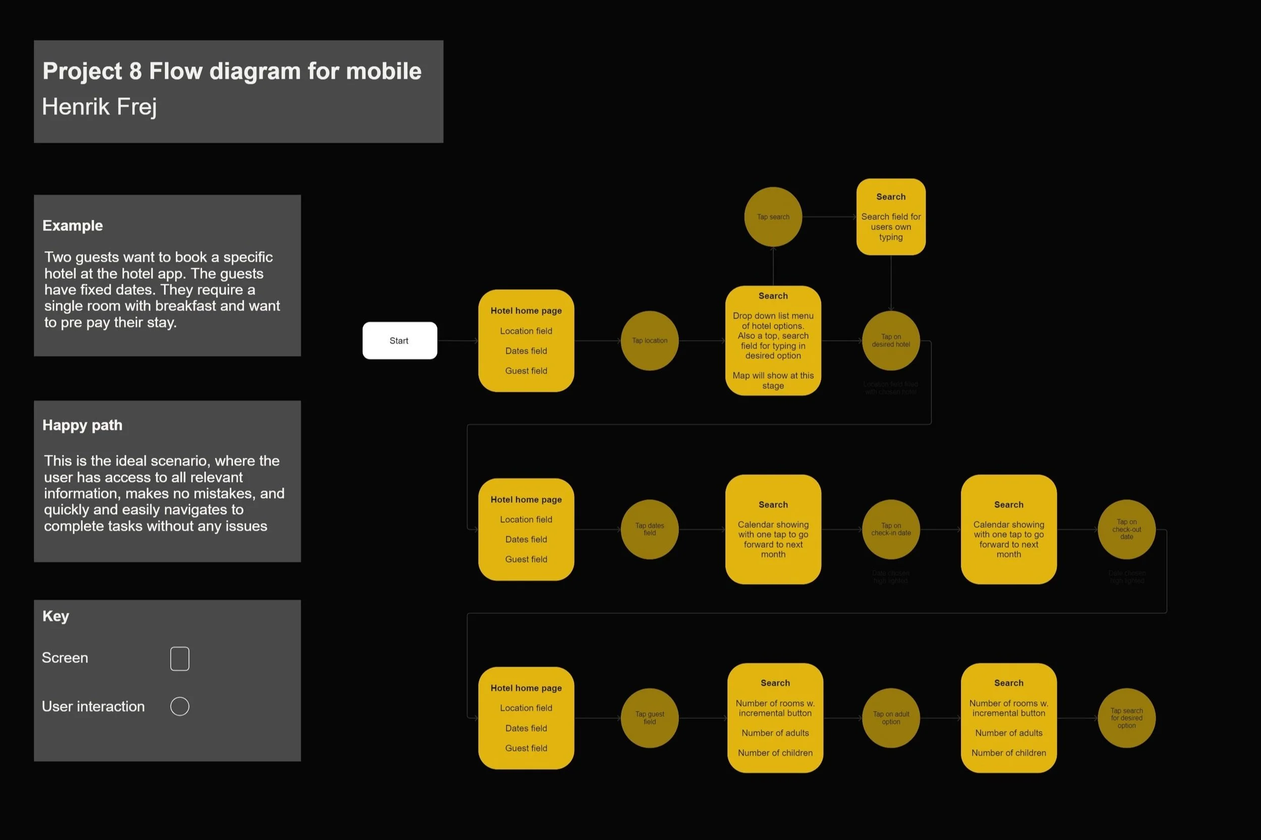 A flow diagram outlines the step by step process a user follows, starting from app launch to completing a reservation, Including stages such as searching for a hotel, selecting dates, choosing a room, entering payment details and receiving confirmation. The diagram helps visualize the user journey and ensures a seamless and intuitive experience for the user.