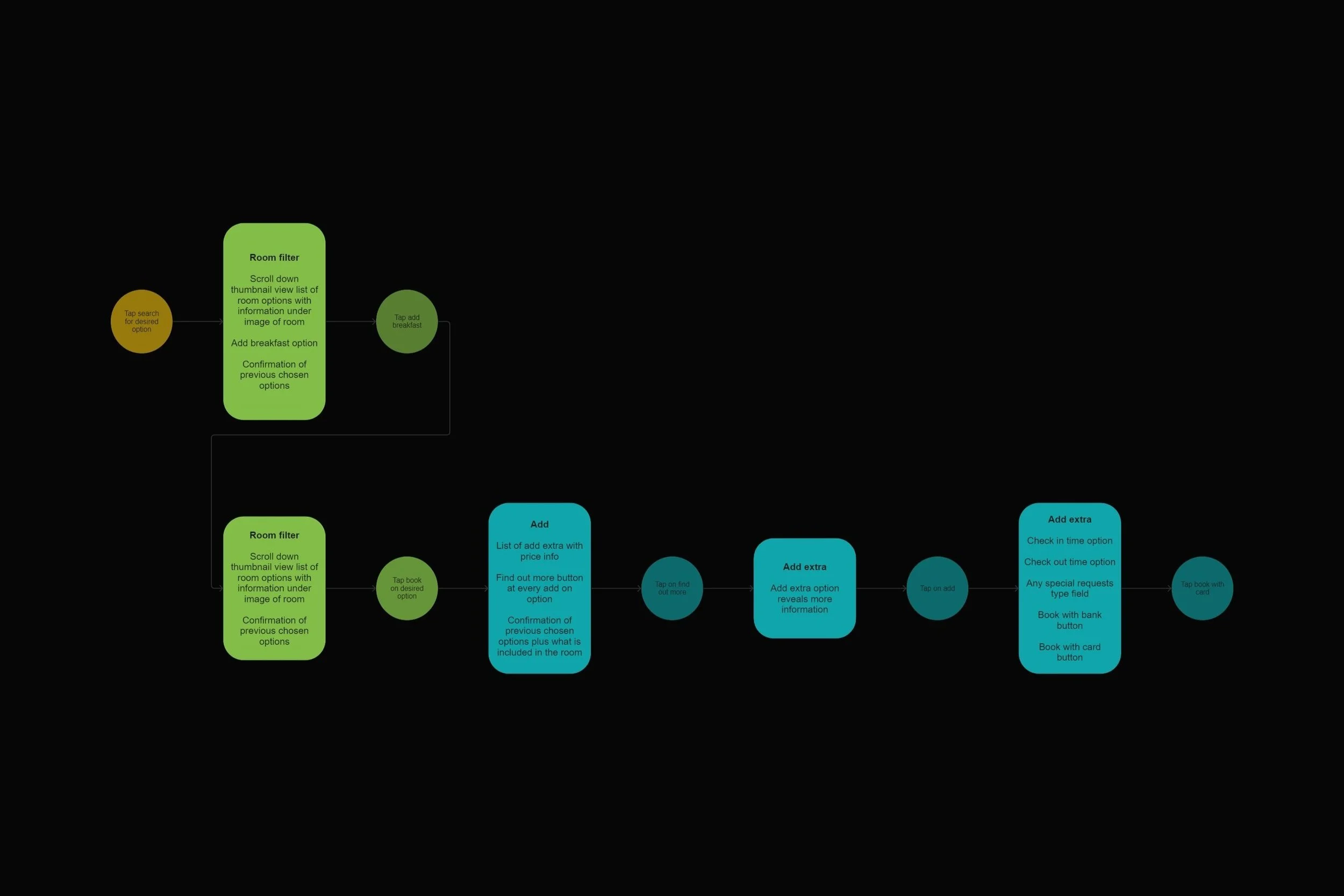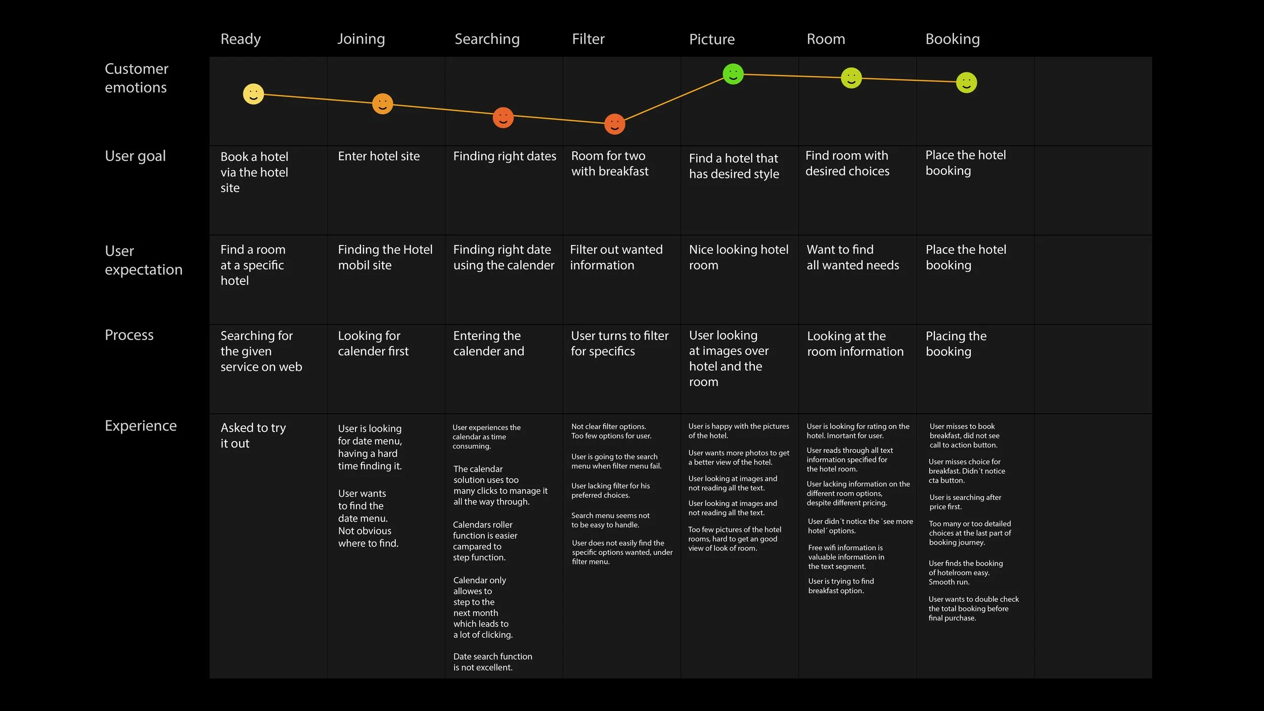 The diagram illustrates the user’s experience from initial step to booking of hotel room. It highlights touchpoints like searching, filters, pictures, choosing room and booking. Goal is to identify pain points and opportunities for improvements in the user’s interaction with the app. Result is showing the need of smooth interactions and importance of good images to set the user in the right mood. Booking should also be very smooth with no struggle.