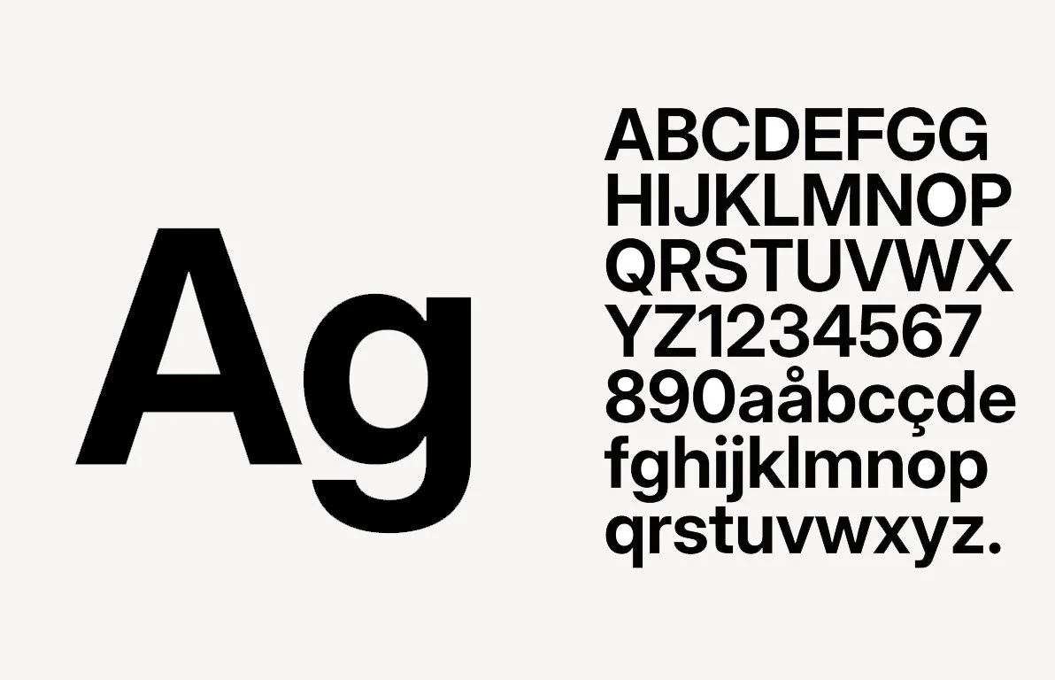 The typography is Inter, it is minimalistic and works well in a bold feature. The text is centered and often directly on the images.