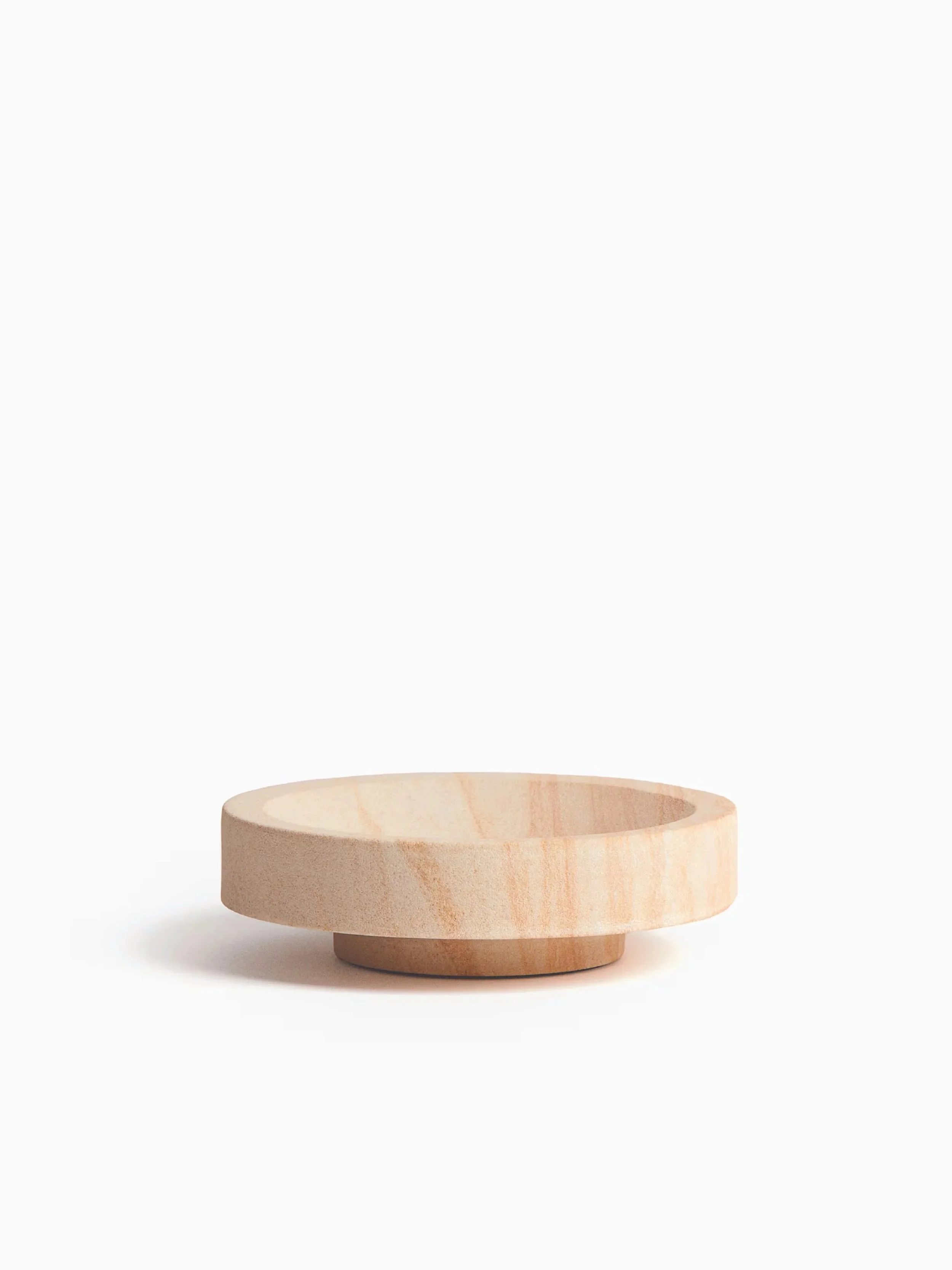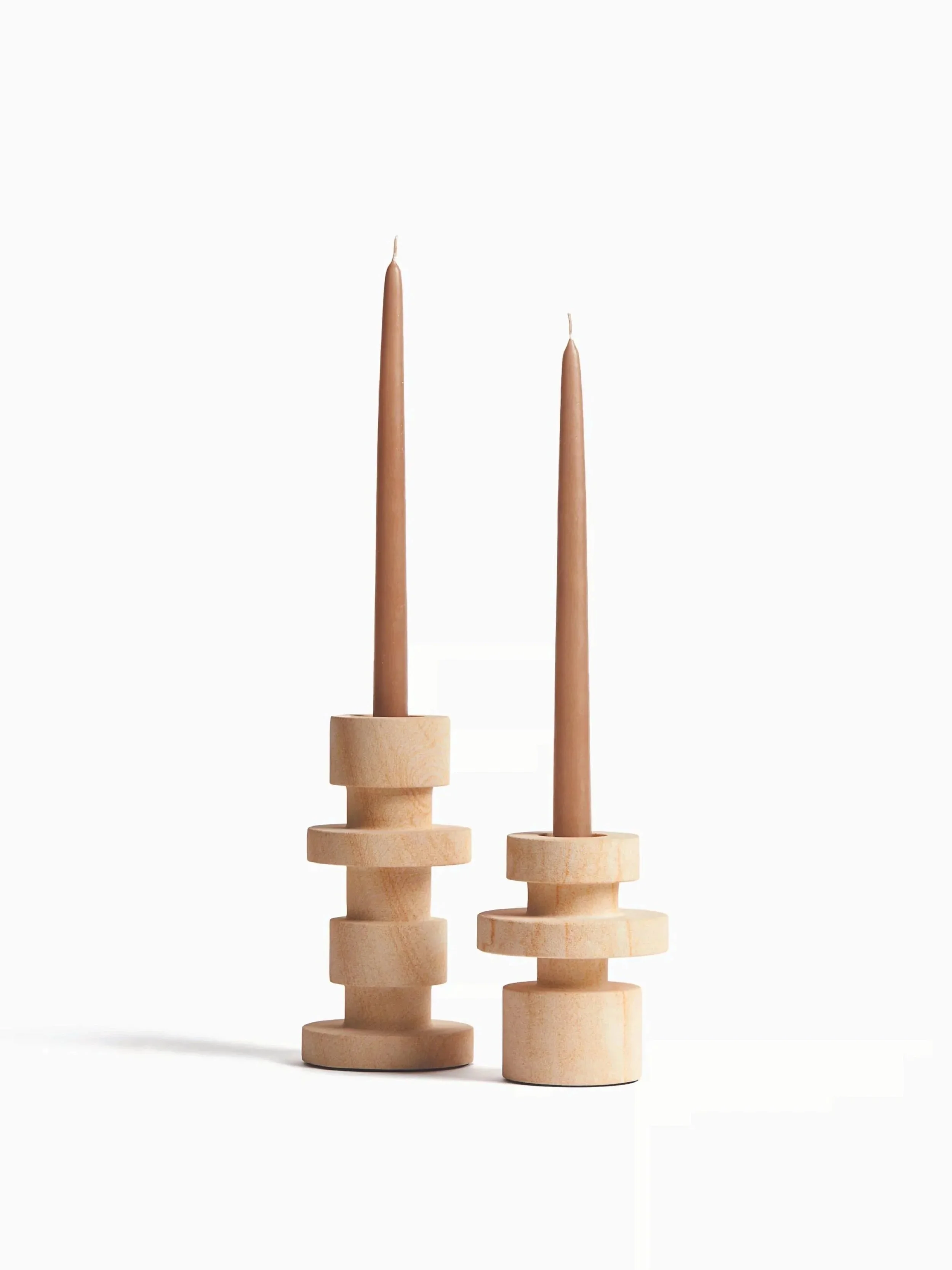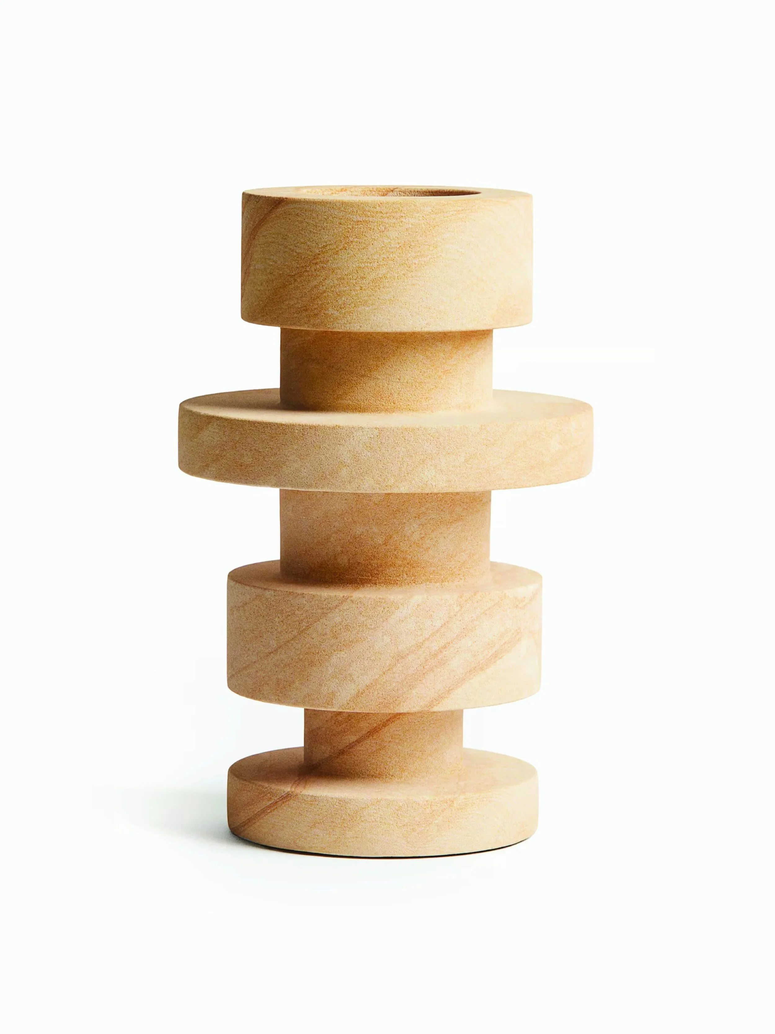 A product group in sandstone with flat sharp cylinders stacked to create a visual movement.