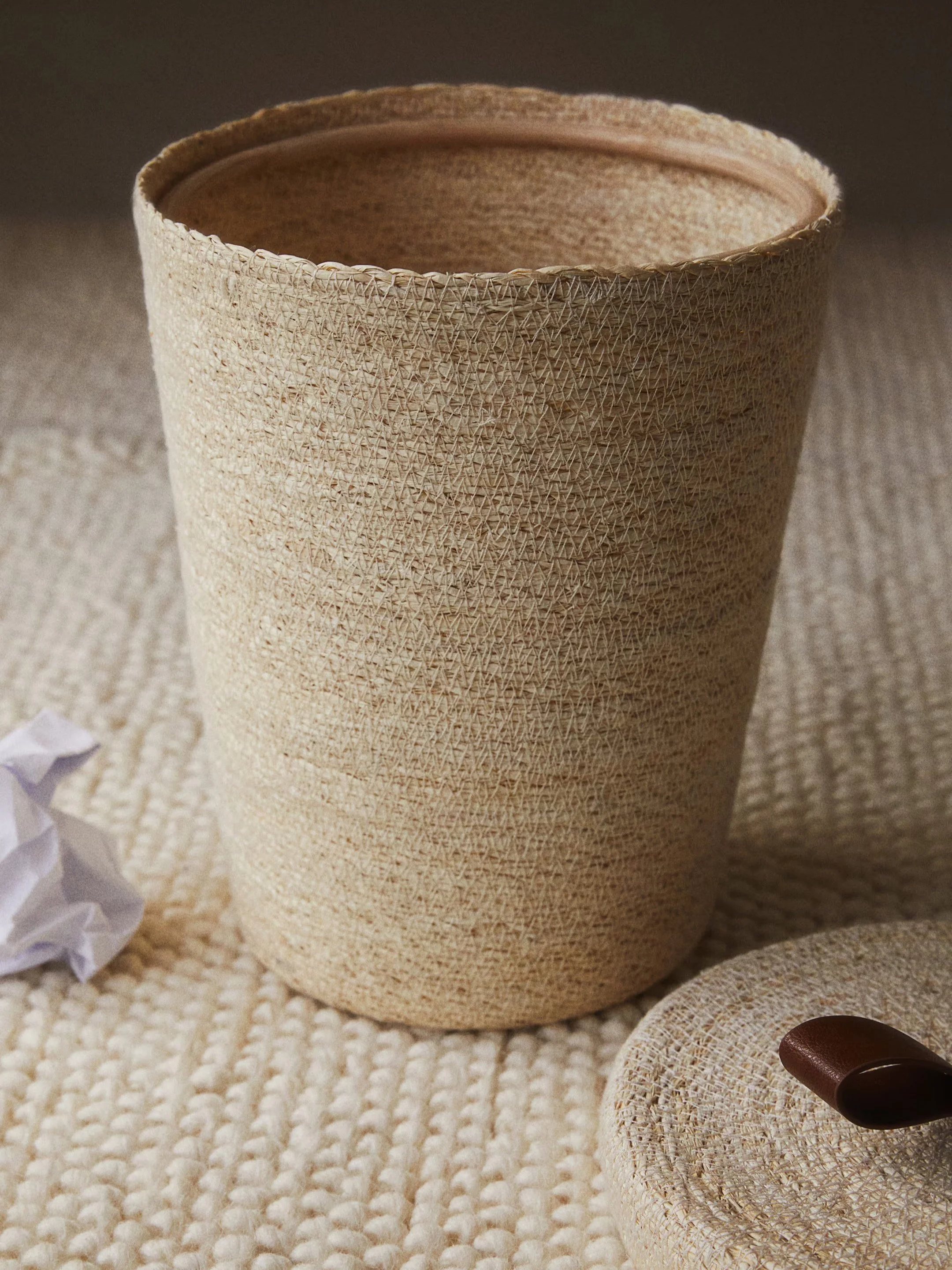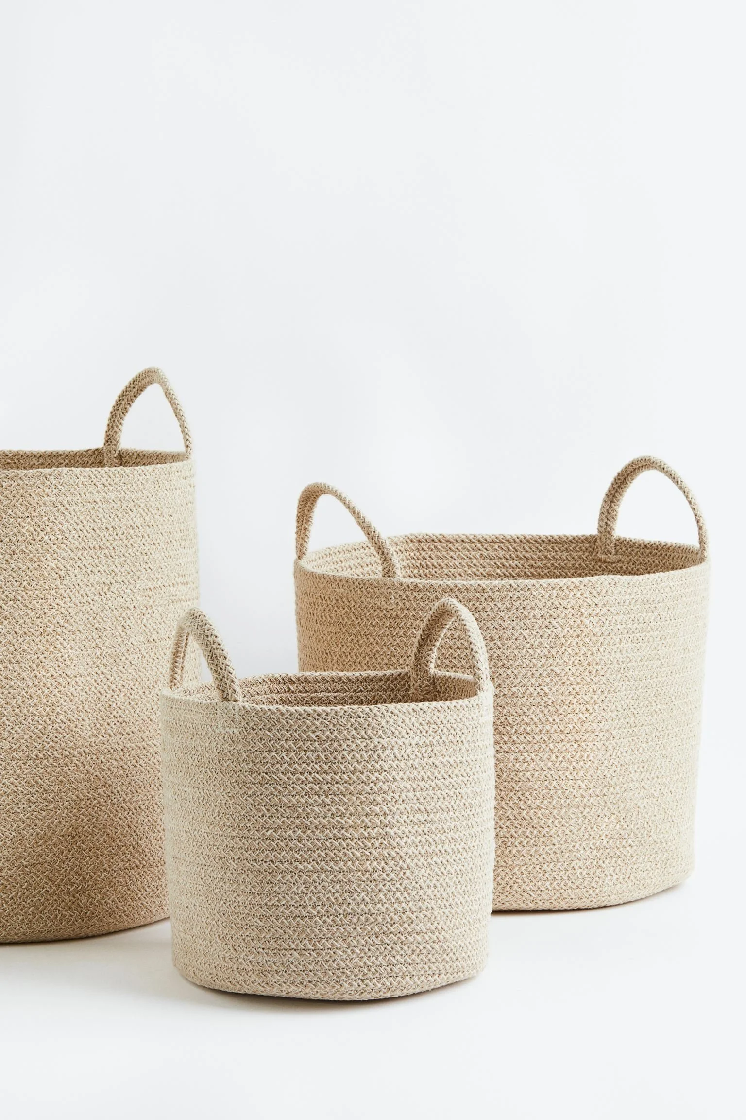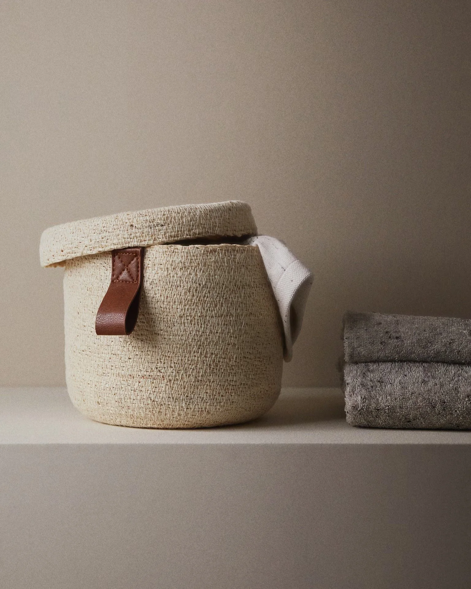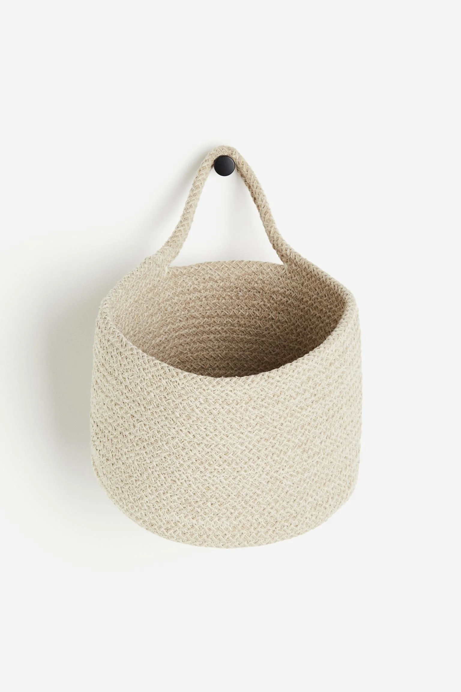 Storage basket in sturdy, braided cotton with two handles at the top.