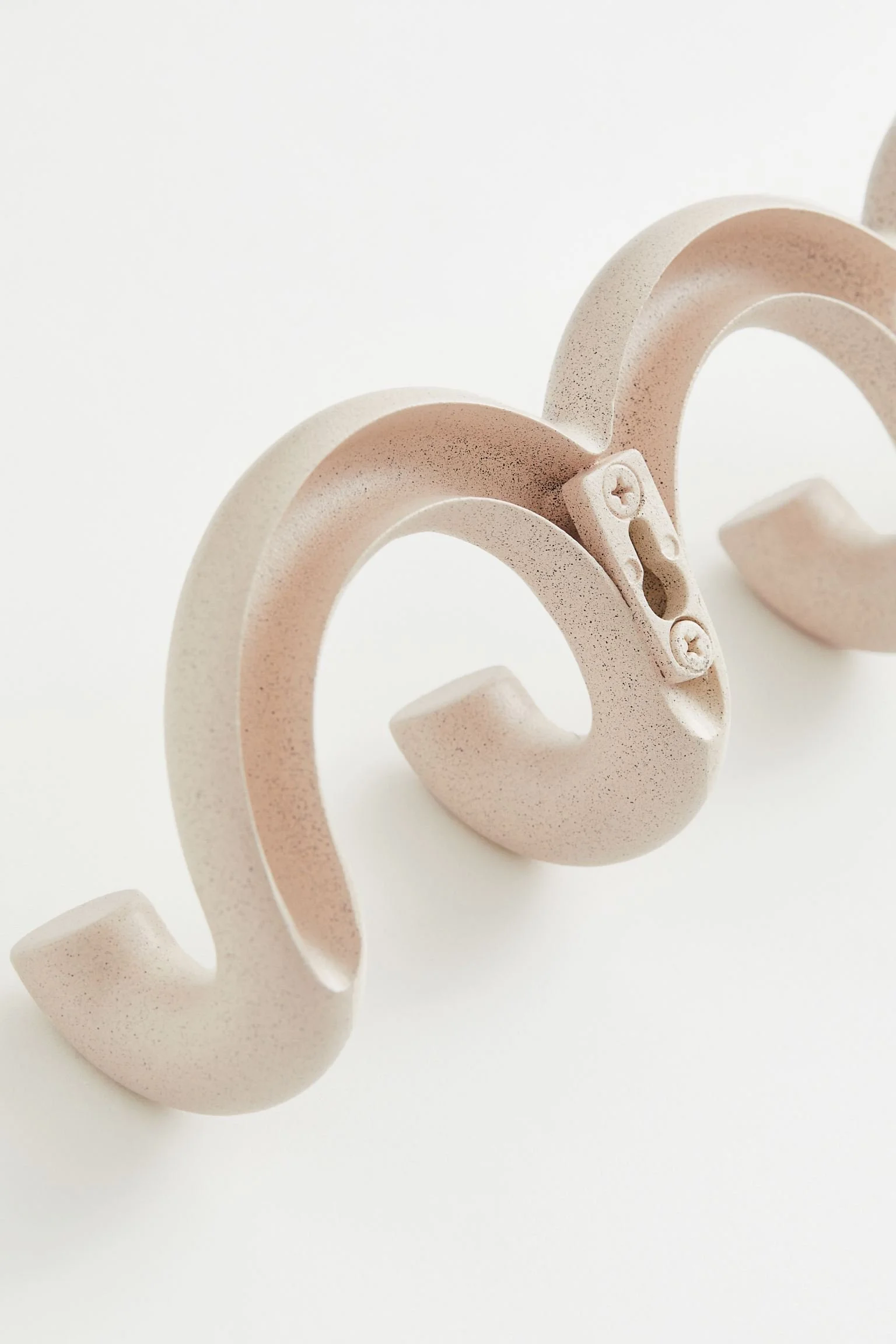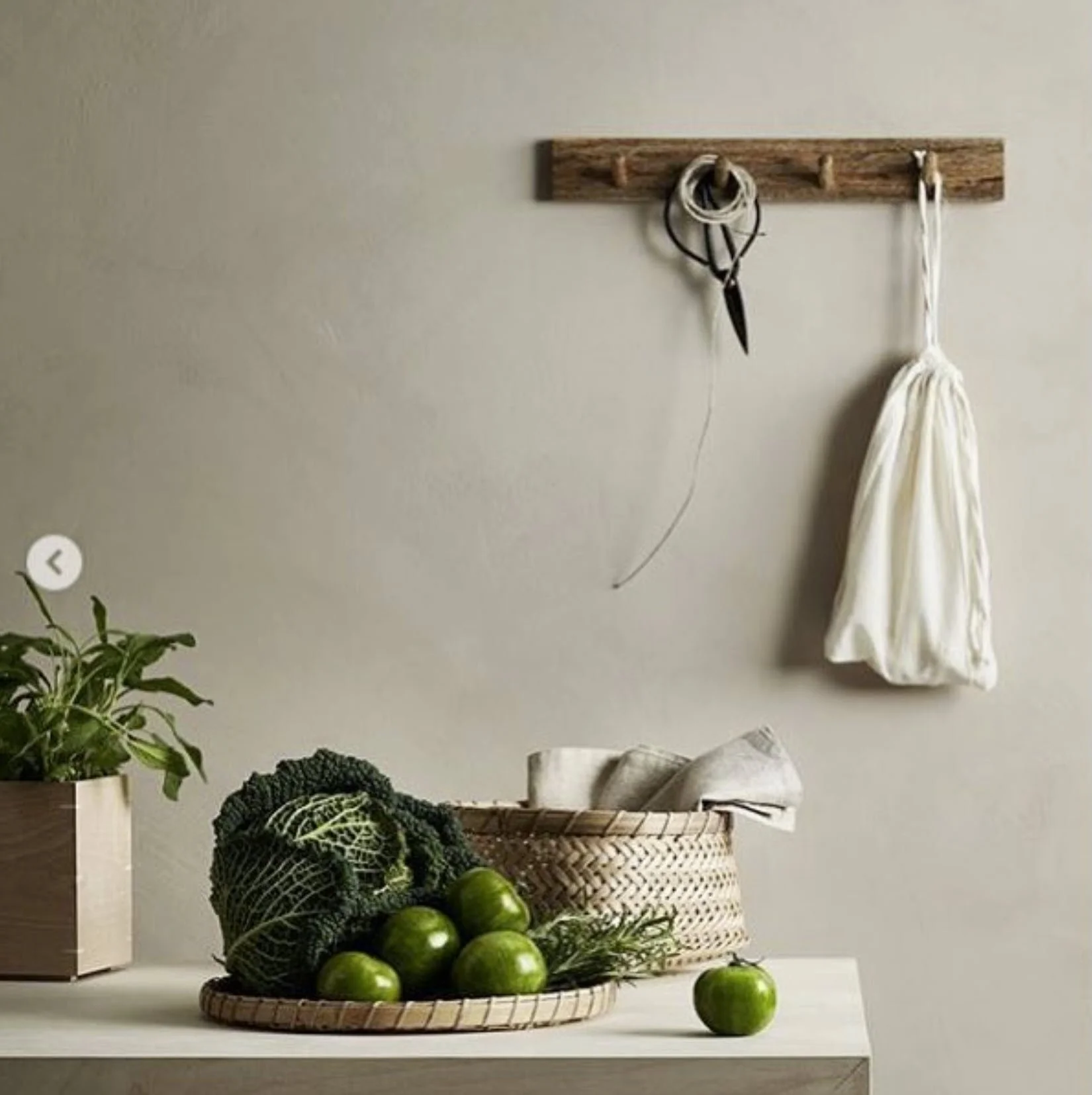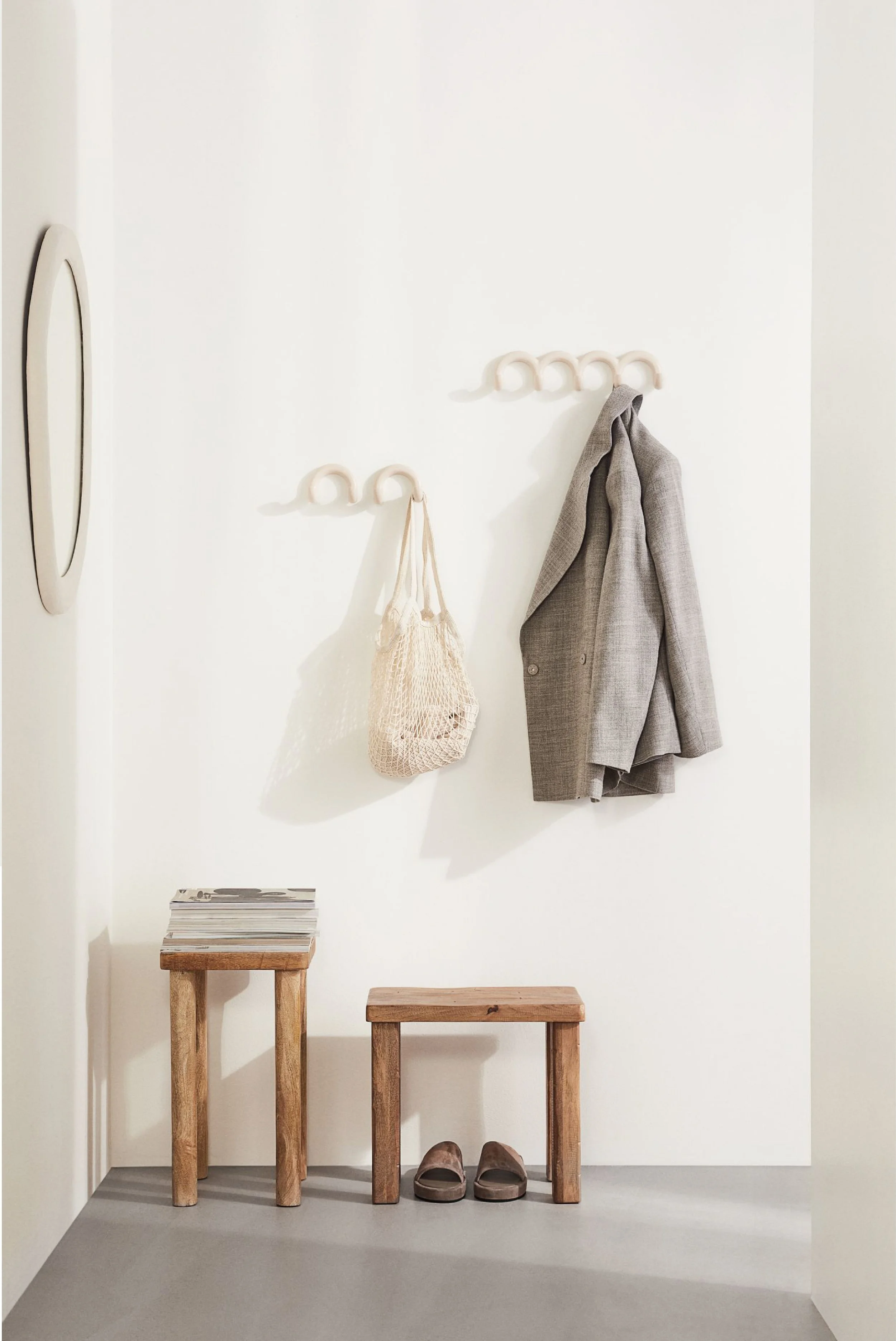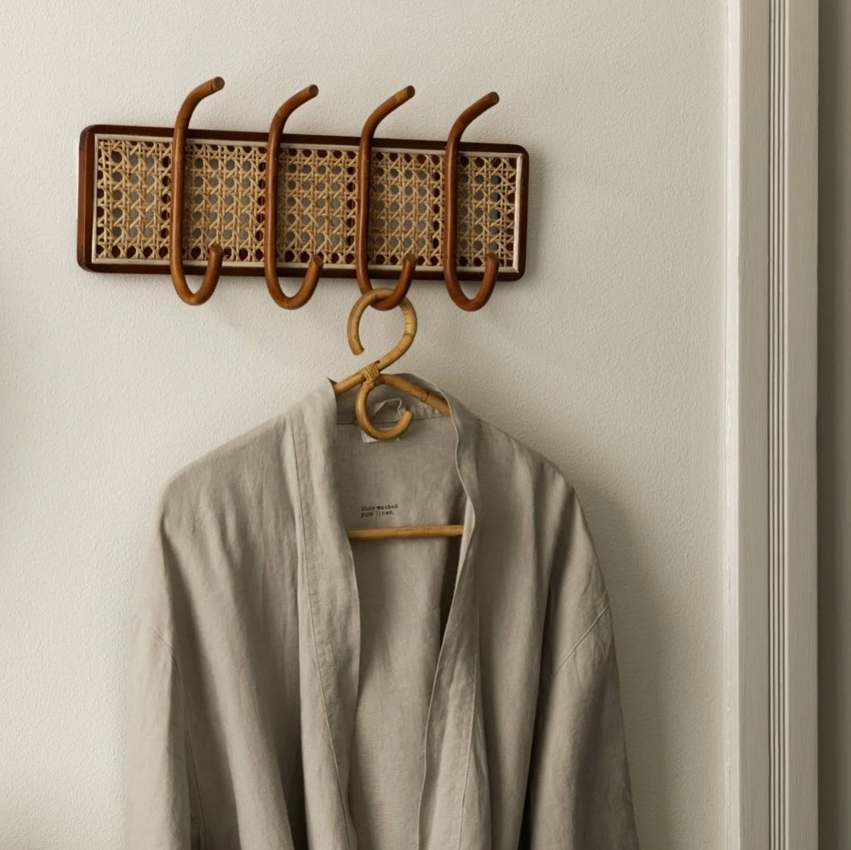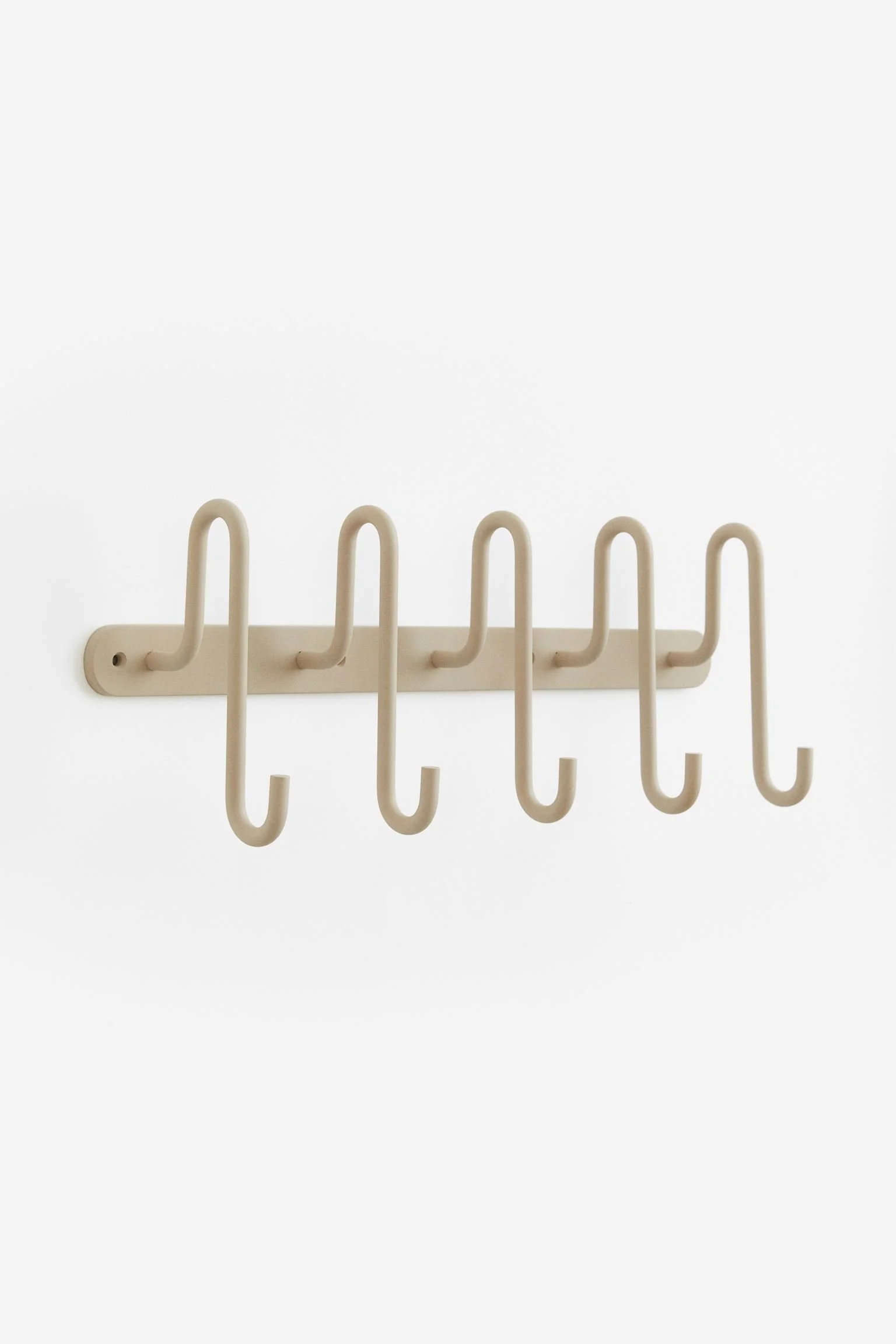 A hook strip in birch wood with seven hooks. Pre-drilled holes for easy hanging.