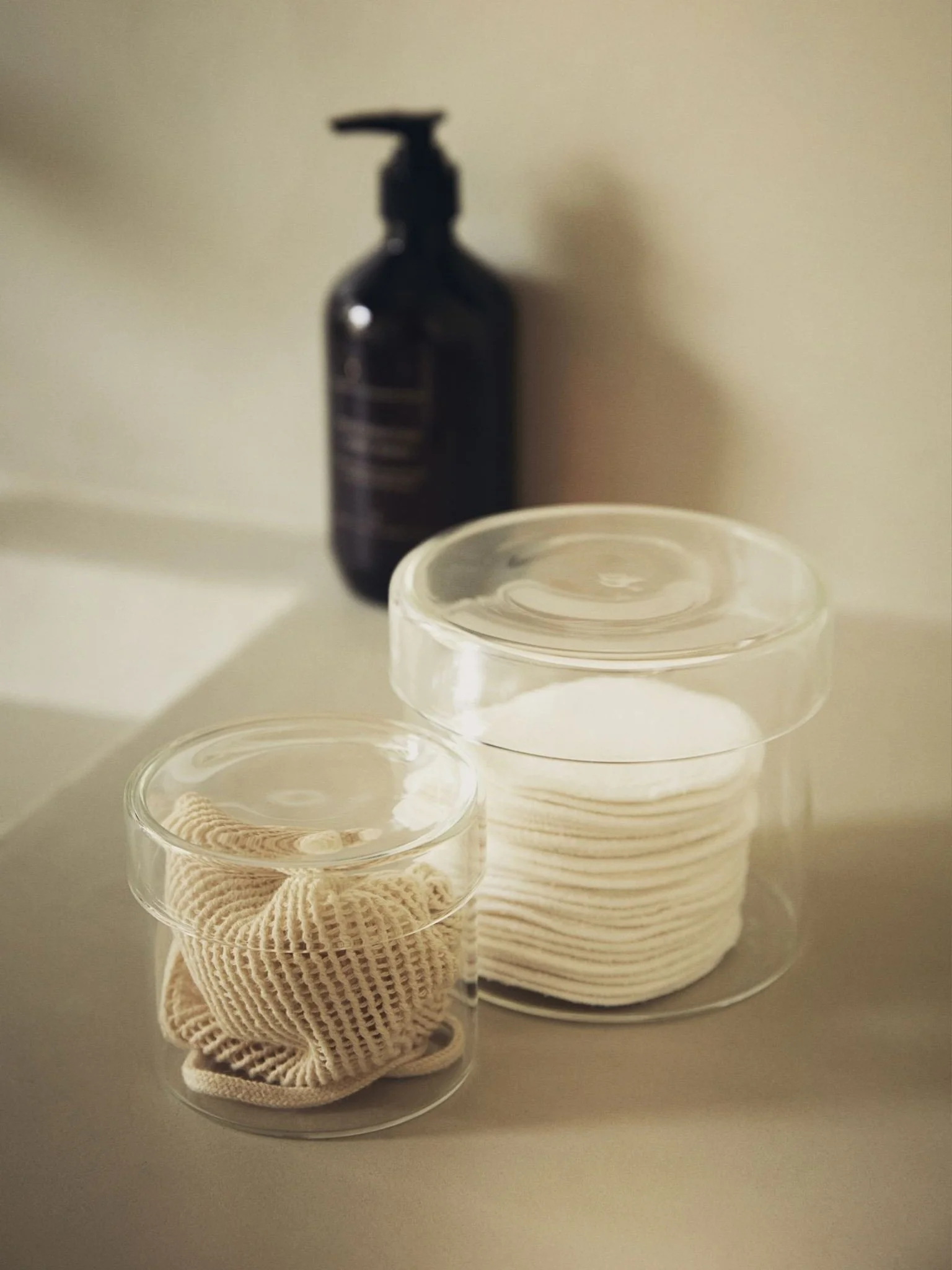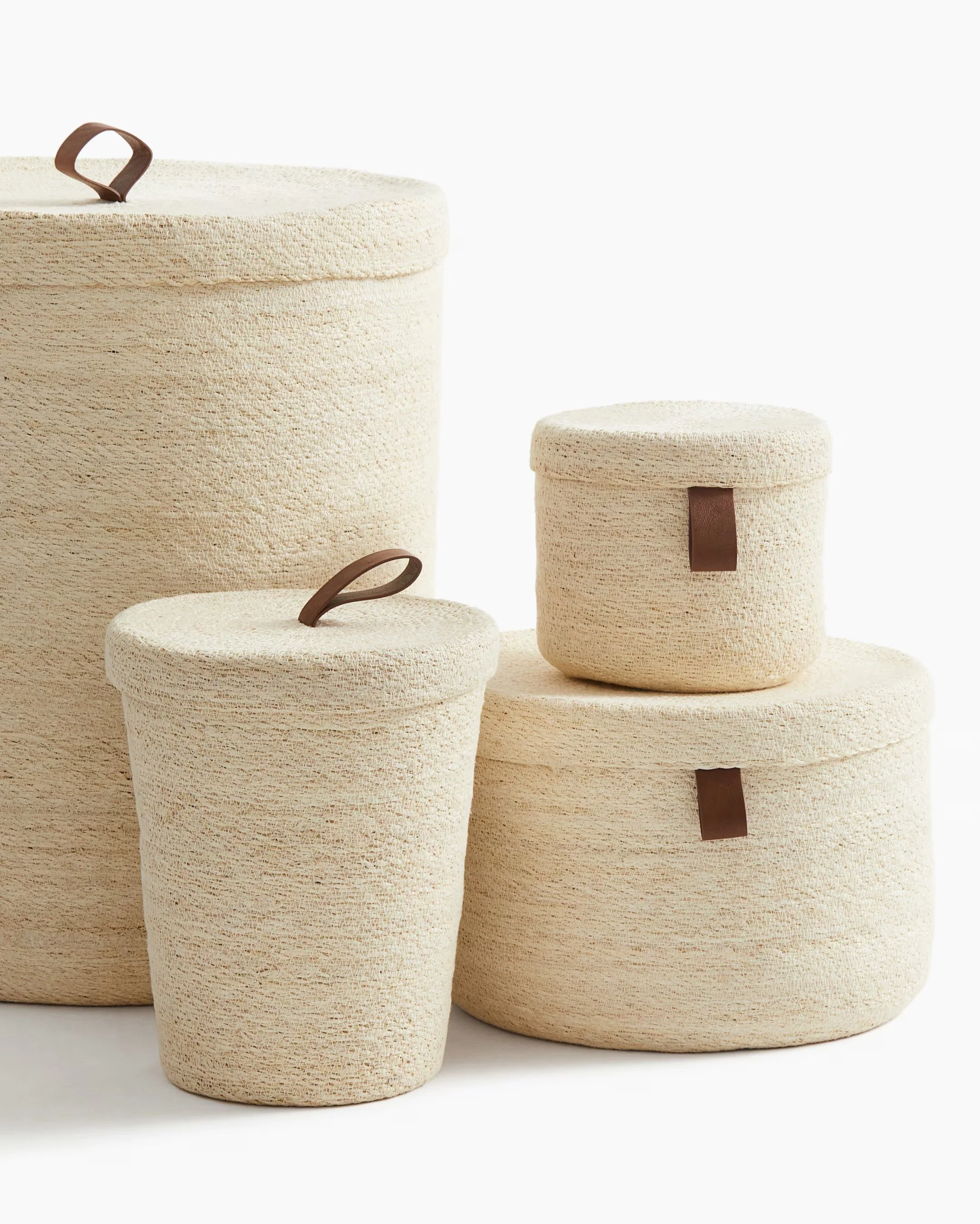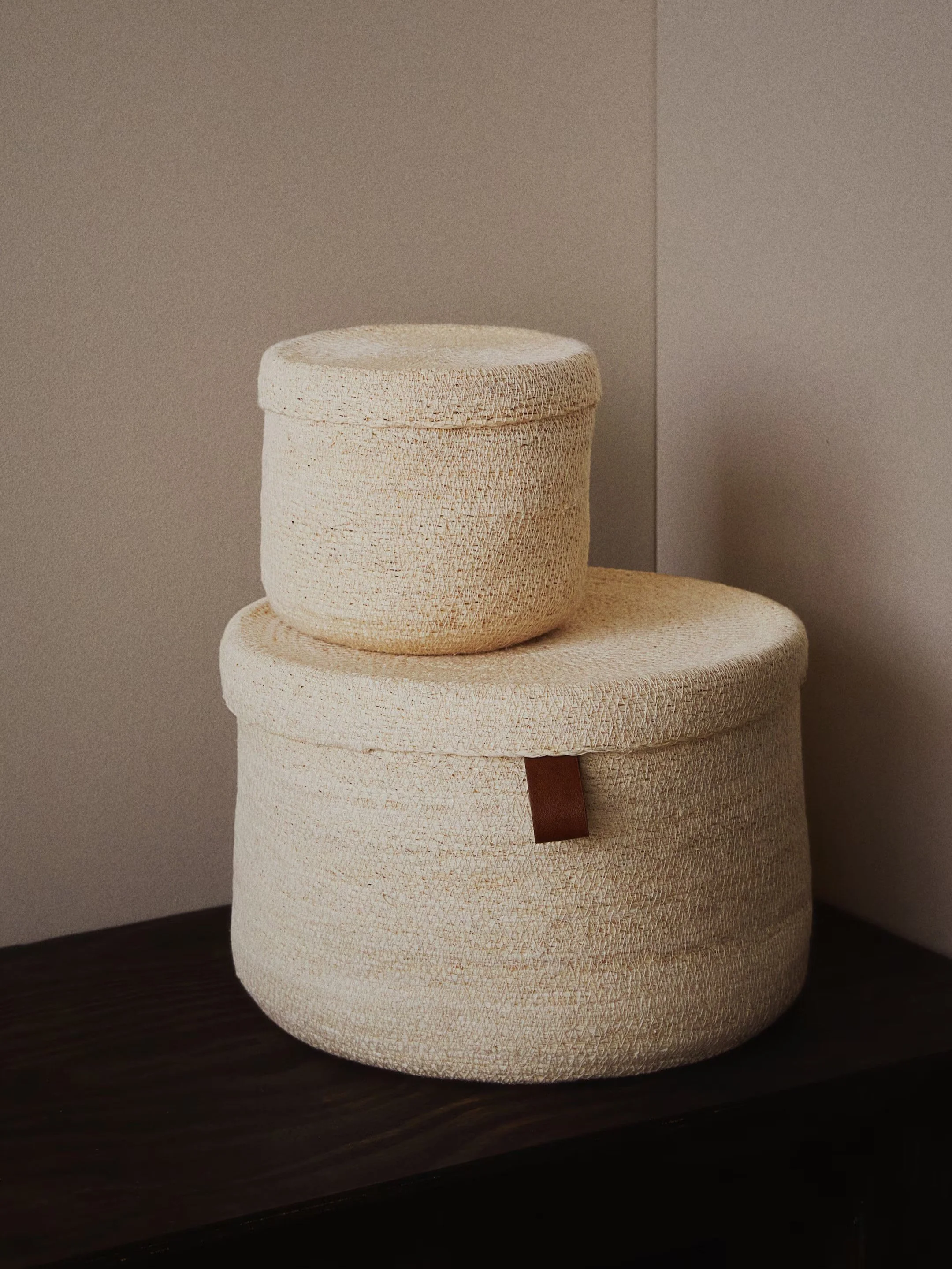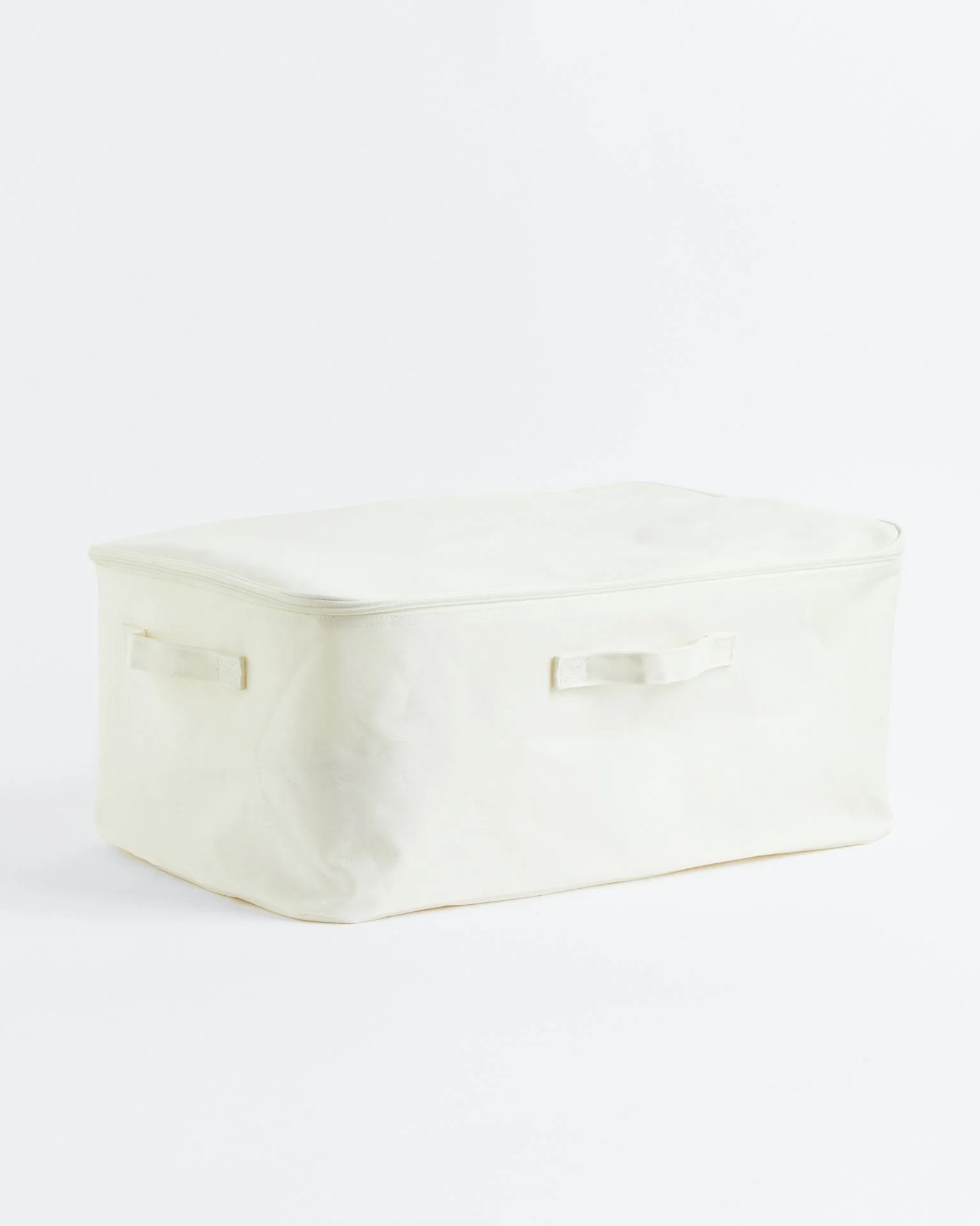 Storage basket in unbleached cotton twill in many size options, both open and with a lid that closes with a zip.