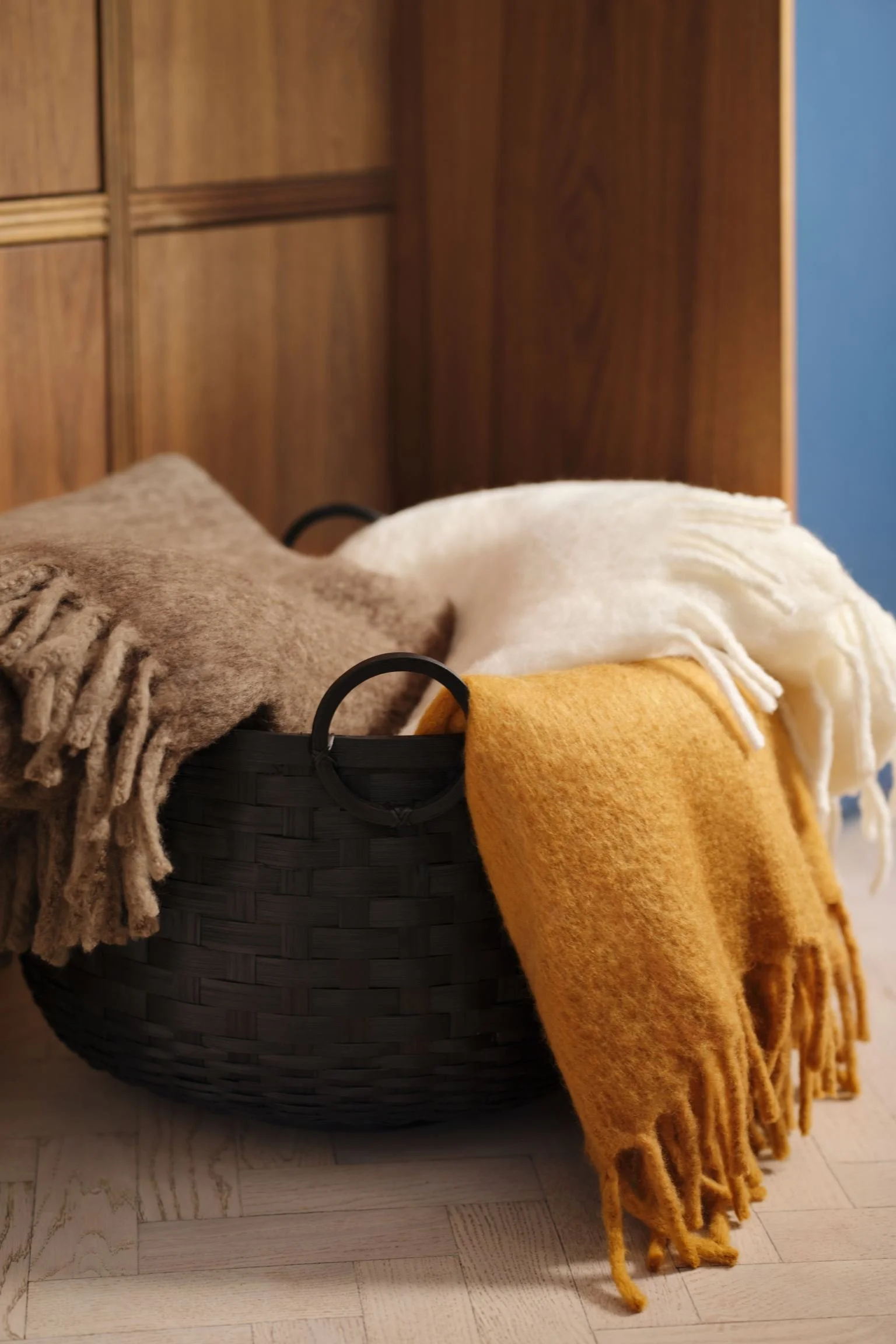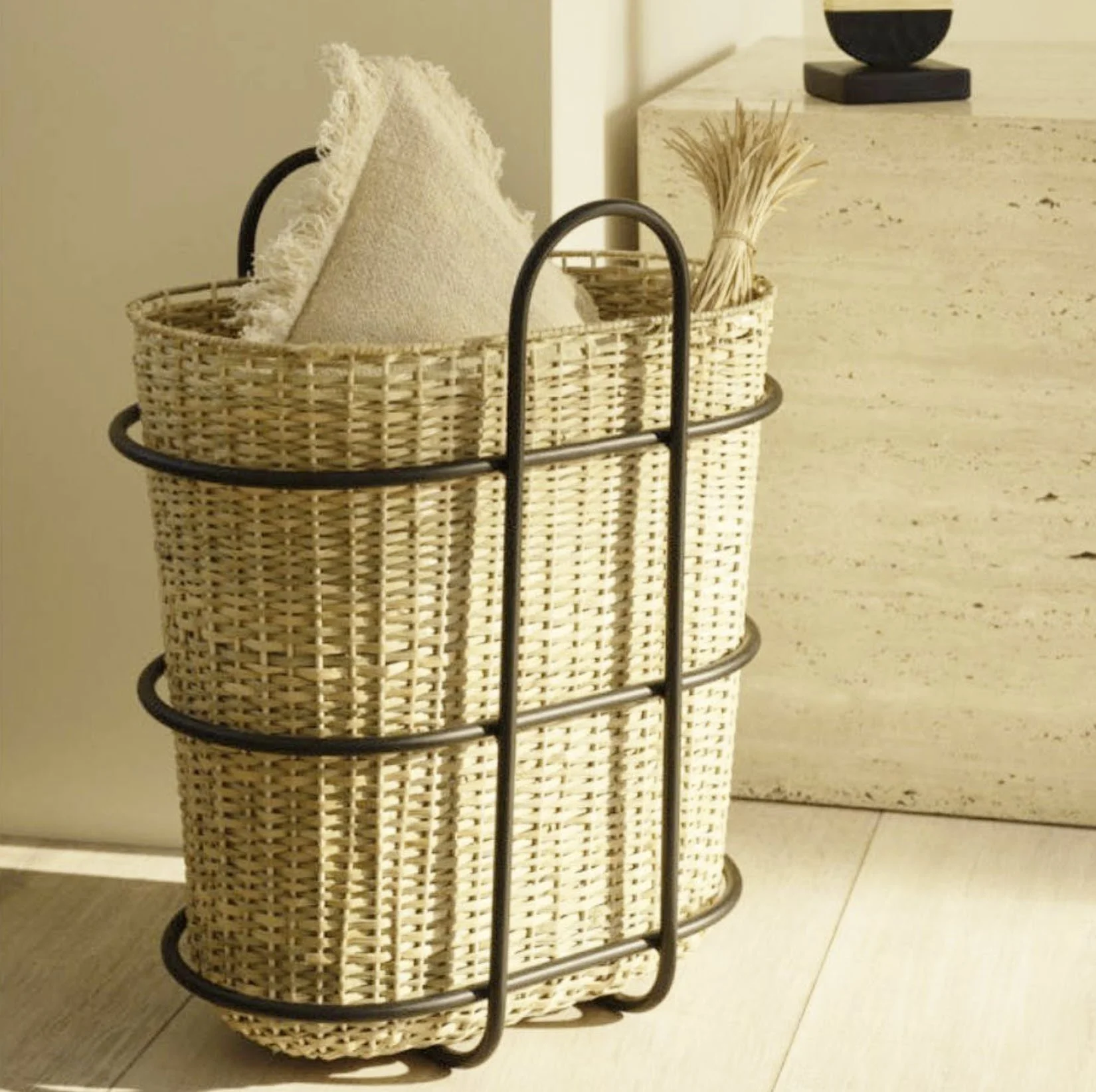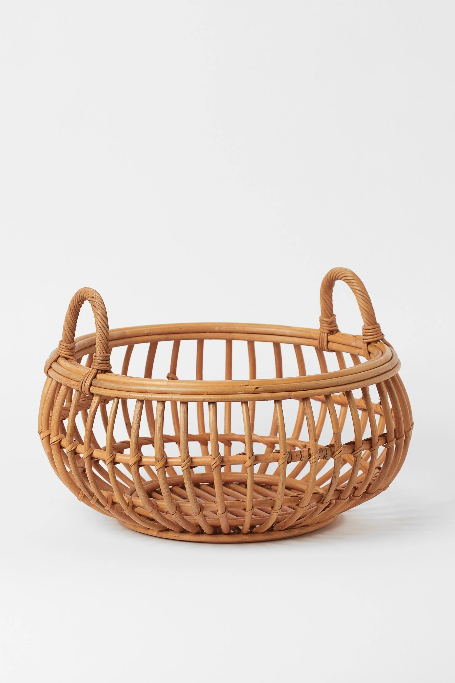 A large storage basket in woven bamboo with characteristic handles at opposite sides.