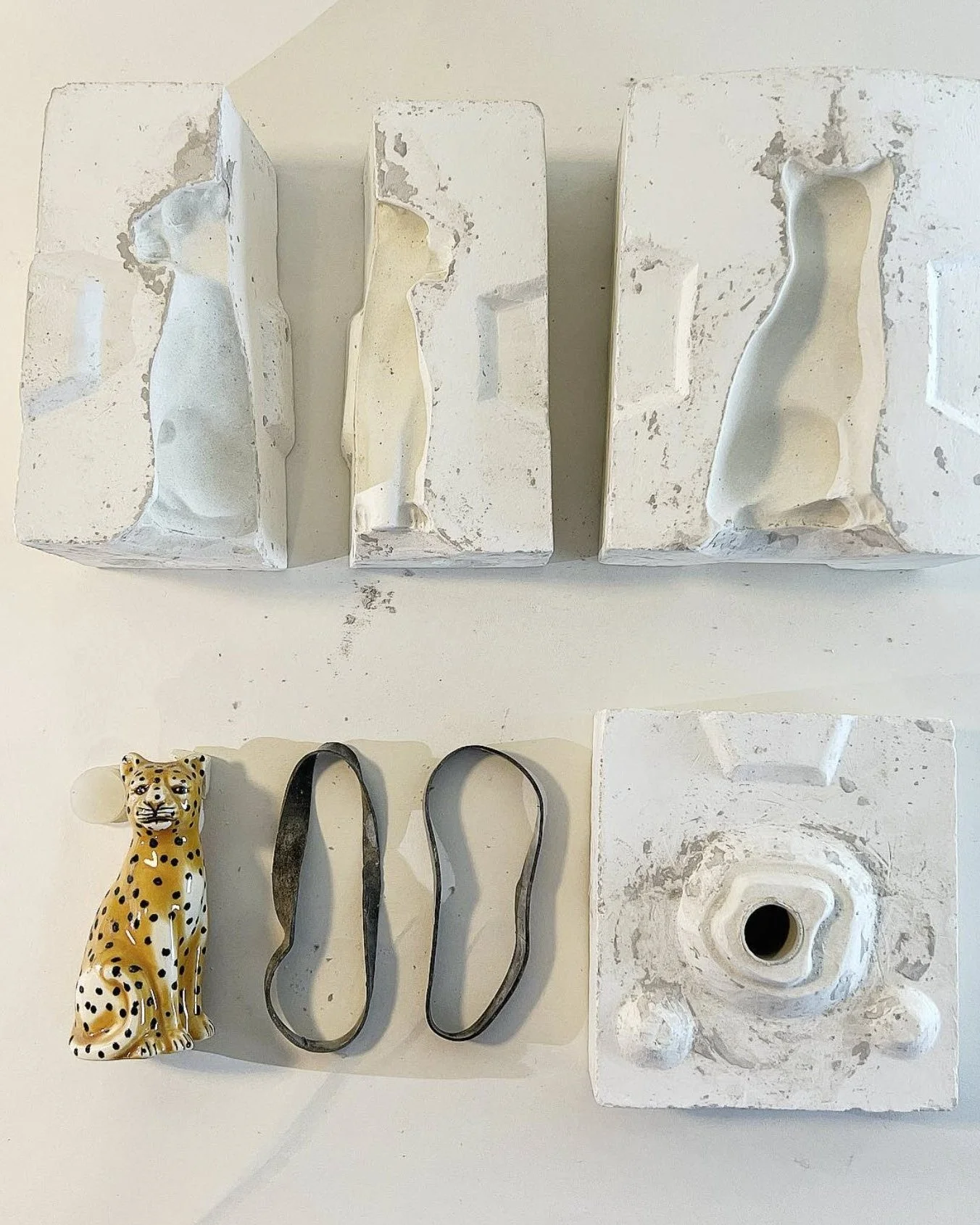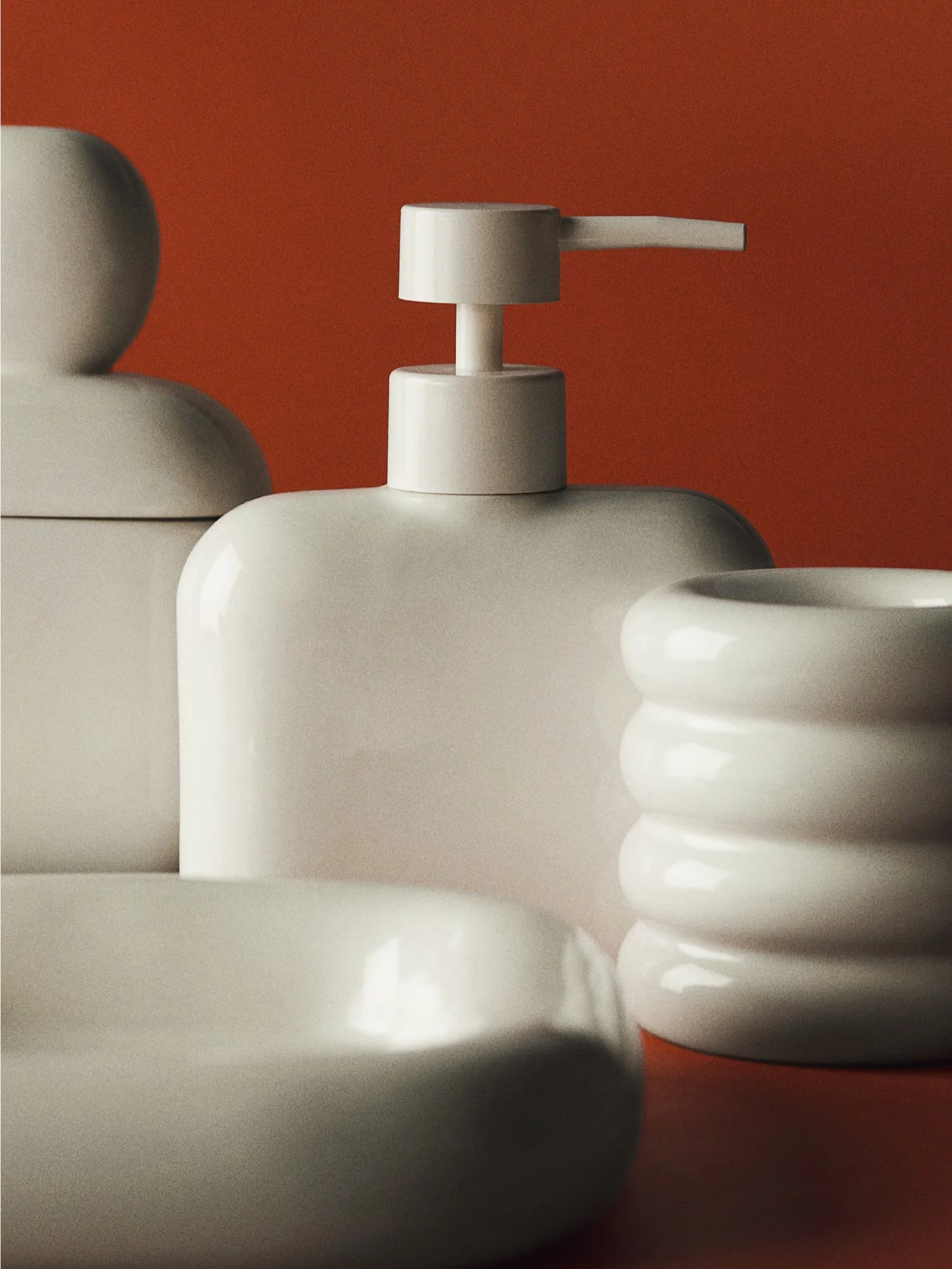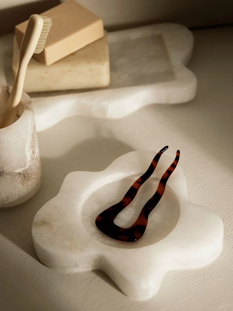 A product line in Alabaster stone with flowing wavy shapes combined with geometric elements