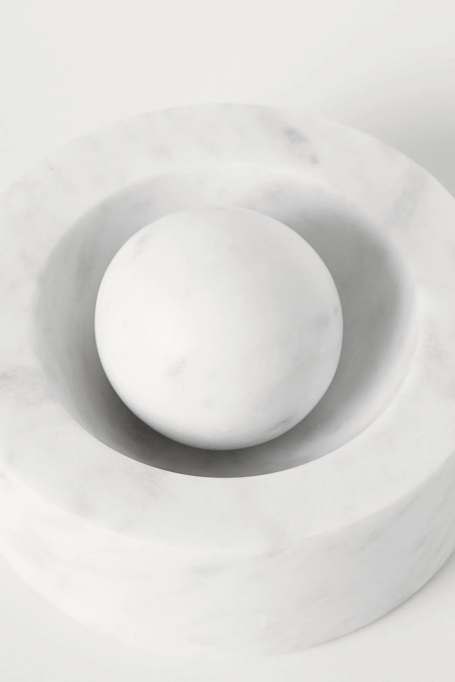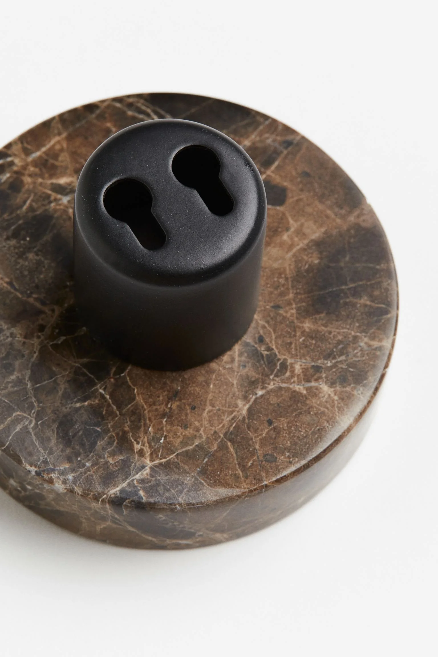 A marble puck hanger with a metal fixture at the back for easy wall mounting.