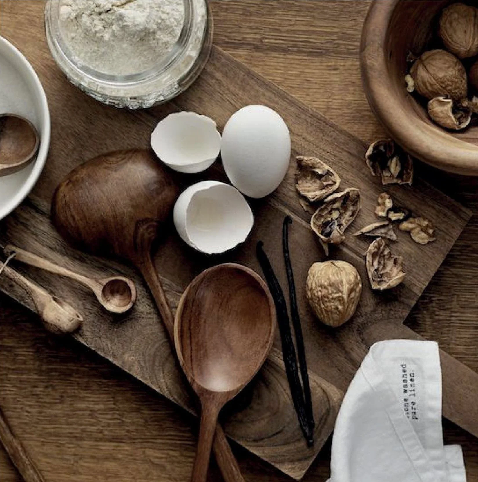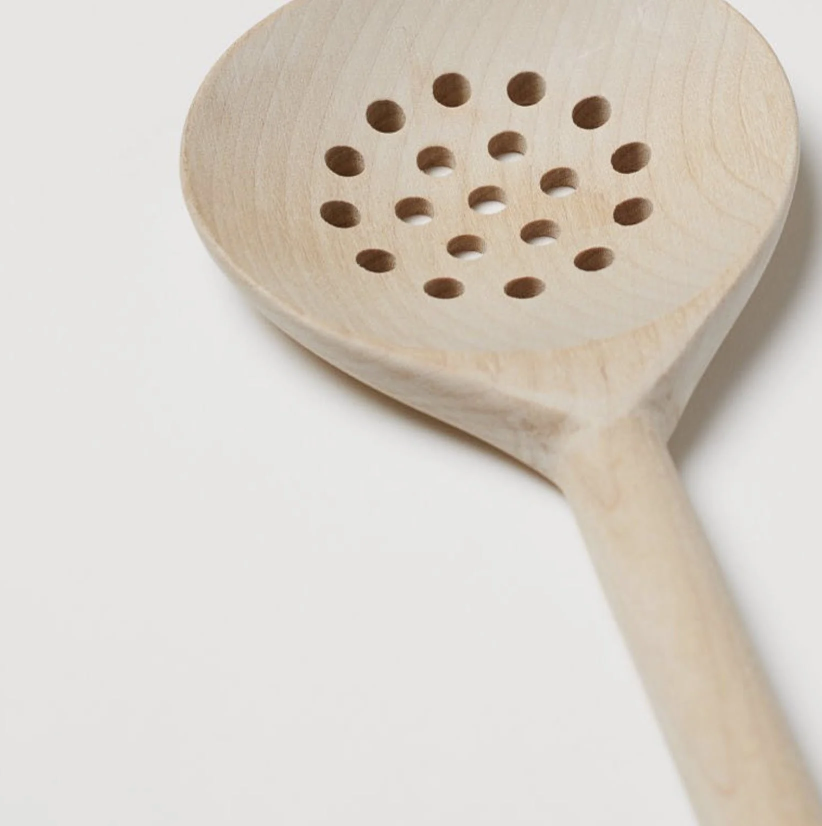 Birch tong, ladle, spatula and skimmer for proper cooking.